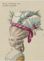 Léonard had been imbibing all that evening describing his state as “fairly loaded with spirituous vapors.” Yet at the queen’s summons, he pledged his muse to Bacchus and went to work. His head full of spirits –plus a few cups of coffee-- served him well. He parted, he teased, he combed and back combed and an hour later the young queen was topped with a ‘do' of three enormous white ostrich plumes, held together with a pink furbelow and a large ruby to keep it all together.