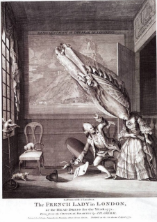 The year she was crowned at the death of Louis XV, Léonard was still working for other court ladies. The Duchess of Chartres beat Marie-Antoinette to the punch with the Pouf Sentimental worn in 1774, full on with little wax cupids, a dish of cherries, a parrot, her newborn and his servants wrapped up in 13 – 14 yards of gauze. From there the pouf took off like wildfire.