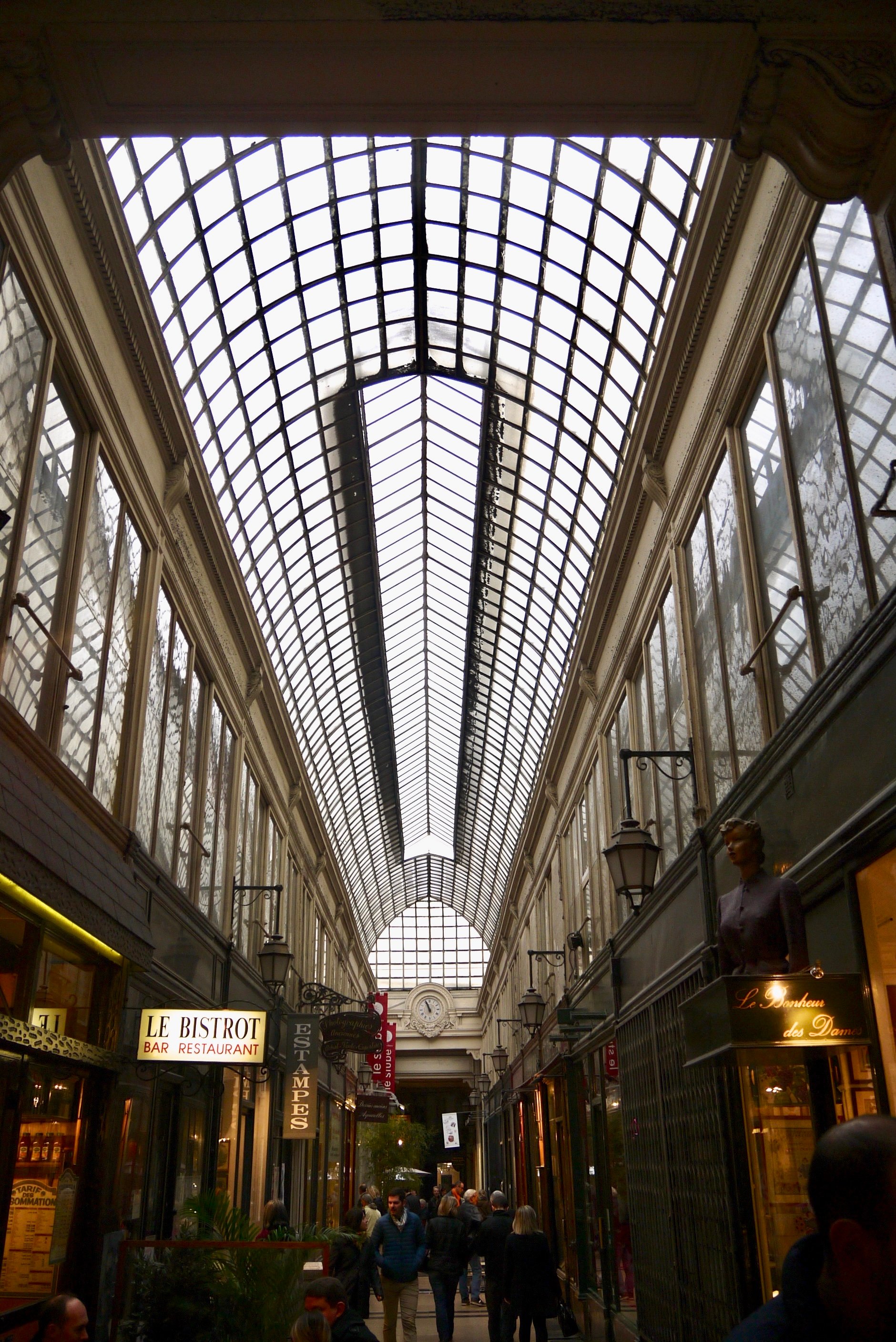 These days far more respectable merchants sell their wares, and it's a wonderful place to browse. Its 12 meter high glass roofing -- the grandest of all the arcade ceilings – allows what light there is on a rainy Paris day to filter through, or simply lets you enjoy the patter of the raindrops as the soundtrack to a peaceful stroll through its many charms.